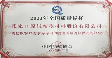 2023年12月,張家口原軾新型材料股份有限公司憑借 “構(gòu)建以客戶需求為導(dǎo)向的敏捷質(zhì)量管控模式的經(jīng)驗”,榮獲2023年全國質(zhì)量標桿企業(yè)。